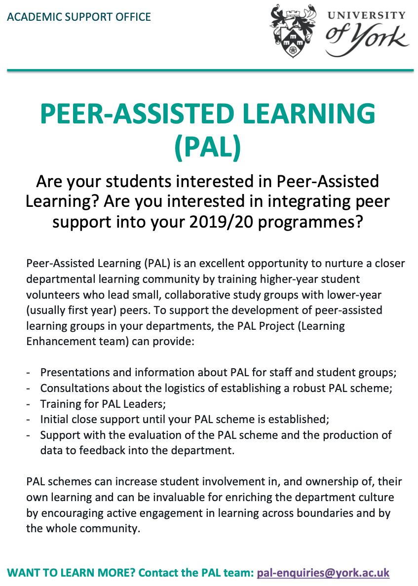 Peer-Assisted Learning (PAL) is an excellent opportunity to nurture a closer departmental learning community whereby trained higher-year student volunteers lead small, collaborative study groups with lower-year peers. To encourage the development of focused peer-support schemes at York, in 2017/18 the Learning Enhancement team (ASO) piloted a framework aimed at assisting departments in developing their own Peer-assisted learning (PAL) schemes. This workshop will report on the key findings from the pilot and outline the Peer-Assisted Learning at York framework. Come along to hear how the PAL framework can support your students and staff to build effective learning communities.