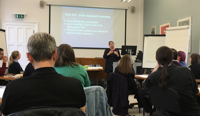 Following this, Katy described the strong links to the principles of the York Pedagogy together with the Teaching Excellence Framework and York Strengths. The remainder of the session was led by the PAL leaders, Nicola and John, where participants were requested to individually identify which of the 21 principles were most important and then, in groups, collate individual feedback and identify four principles to agree on. Following feeding back to all participants, attendees had to note down what they had learned from the session together with questions they had on a large piece of paper, which was then circulated around the groups and discussed. Being able to practice PAL in this way was certainly the most interactive and engaging part of this excellent workshop, providing participants with a real insight into the benefits of adopting a PAL approach. Finally, attendees were asked to consider as to whether a PAL scheme would be beneficial for their department.